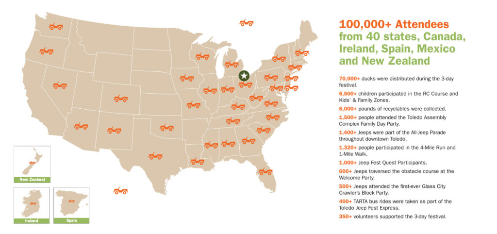 As a Toledo Jeep® Fest sponsor, you’ll have the opportunity to be a part of the next event’s fun and the rich Toledo/Jeep® history. Our 2025 event hosted over 100,000 attendees from 40 states and generated an estimated $8.3 million in economic activity. We are looking for sponsors and vendors to partner with to make the event as dynamic as possible. Contact us to find out more.